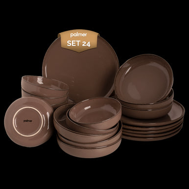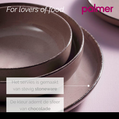 Inhoud serviesset: · 6 dinerborden 28 cm · 6 ontbijtborden 19 cm · 6 diepe pastaborden 19 cm · 6 kommen 15 cm Porselein met een trendy twist, dat is deze 24-delige Antigo serviesset van het merk Palmer. Het verrassend sterke en lichtgewicht porselein van de Antigo-collectie is voor ieder thuis een ultieme vorm van verwennerij! Het elegante bruin beige glazuur met donkere detaillering aan de rand, maakt het Antigo servies speels en elegant. De fraaie vormen stralen absolute comfort uit. Speel met culinaire creaties en laat ze tot leven komen op deze prachtige Antigo serviesset. De opvallende opstaande rand onderscheid deze borden en schalen van doorsnee (platte) borden en maakt het servies bijzonder en chique. De borden en schalen uit deze serviesset zijn gemaakt van extreem sterk en lichtgewicht porselein. Porselein is oven- en magnetronbestendig tot een temperatuur van 300°C en kan na gebruik gereinigd worden in de vaatwasmachine. Deze set bestaat uit 6 dinerborden met een
